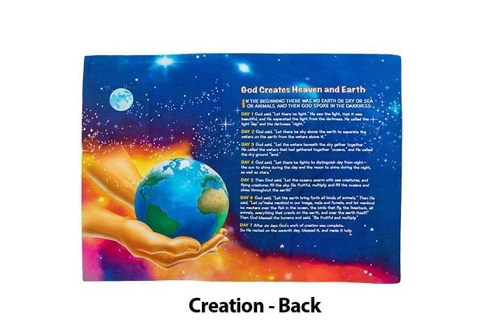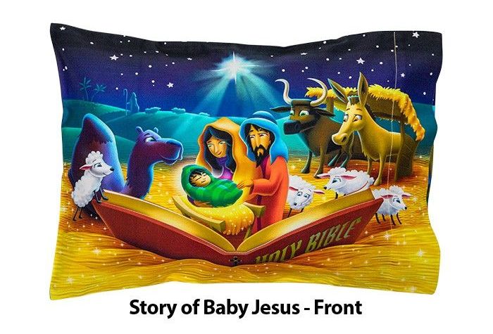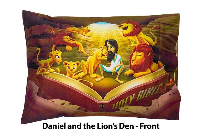 This unique childrens pillowcase (12″ x 18″) combines vibrant childrens bible story imagery (front). and the beloved childrens bible stories (back). that you can enjoy reading to your little one over and over again. Choose your favorite or collect them all! Creation. Daniel and the Lions Den. Jonah and the Whale. Noahs Ark. and the story of Baby Jesus.