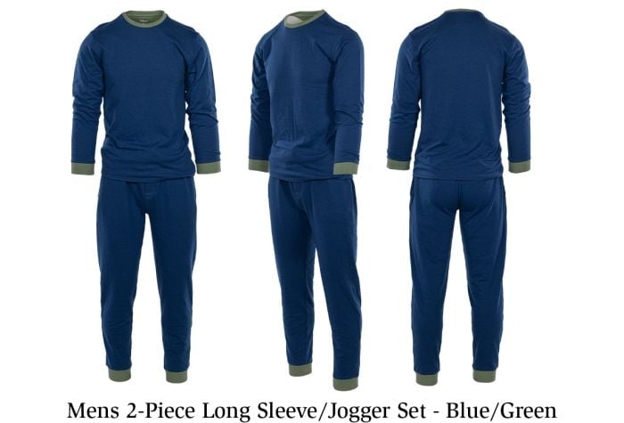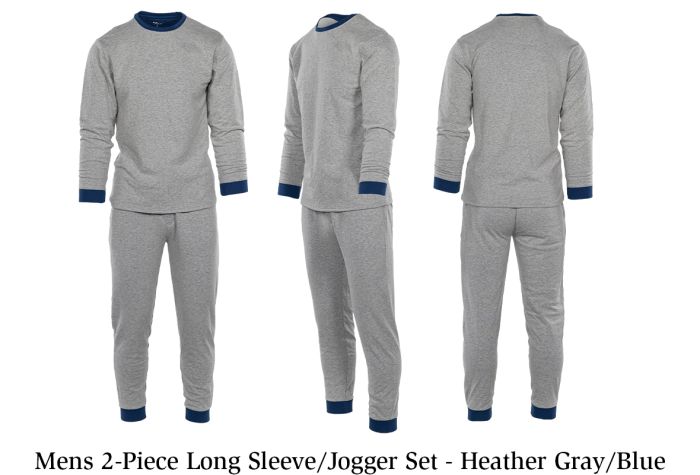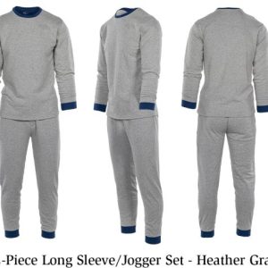 Comfort is key in this ultra-soft PJ set made of double layer cozy jersey fabric. The two layers knit together provide extra warmth for those fall nights. The long sleeve crew neck and Jogger have cuffs and trims that match back to the contrast color of the inside fabric. The Jogger has on side seam pockets. braided drawstring and functional fly.